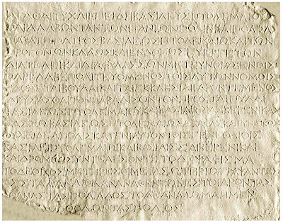 "Υπέρ Βασιλέως Πτολεμαίου του Πτολεμαίου και τη Βερενίκης". Μαρμάρινη επιγραφή.