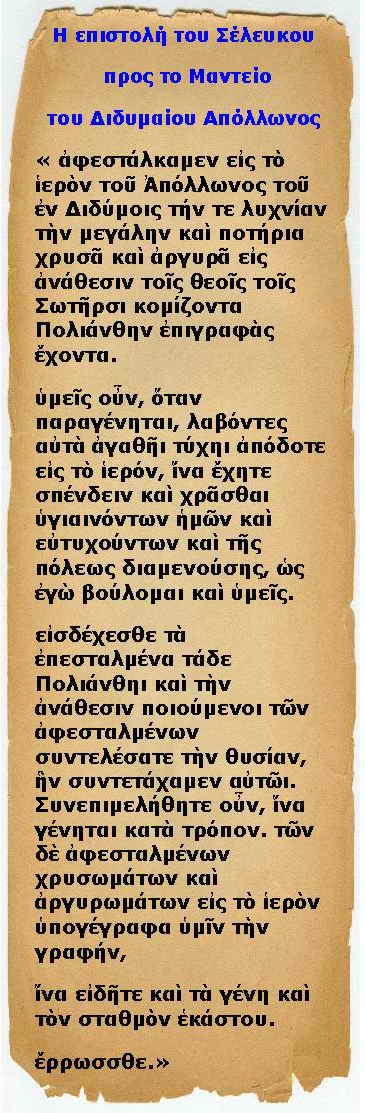 « Στείλαμε στο ιερό του Απόλλωνος που βρίσκεται στους Διδύμους τη μεγάλη τη λυχνία με τα αργυρά και χρυσά ποτήρια ως αφιέρωμα στους Σωτήρες θεούς (σ.σ. εννοεί και την Αρτέμιδα) τα οποία είναι γεμάτα με μύρο πολίου, όπως είναι, άλλωστε, χαραγμένα πάνω σε αυτά.
