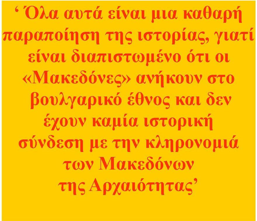 Όλα αυτά είναι μια καθαρή παραποίηση της ιστορίας, γιατί είναι διαπιστωμένο ότι οι «Μακεδόνες» ανήκουν στο βουλγαρικό έθνος και δεν έχουν καμία ιστορική σύνδεση με την κληρονομιά των Μακεδόνων της Αρχαιότητας.