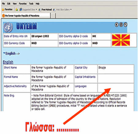 »Στην περίπτωση της χώρα μας το επίσημο όνομα είναι ‘Πρώην Γιουγκοσλαβική Δημοκρατία της Μακεδονίας’ δηλαδή ‘FYROM’ και ως γλώσσα της χώρας αυτής που ήταν μέχρι τώρα η «μακεδονική», τώρα είναι η θέση αυτή κενή.