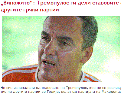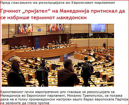 Οι Έλληνες εθνικιστές, άδικα, κατηγορούν τον Έλληνα ευρωβουλευτή, Μιχάλη Τρεμόπουλο, ότι διακατέχεται από ‘μακεδονισμό’, επειδή υποστήριξε το ψήφισμα για την πΓΔΜ, στο Ευρωπαϊκό Κοινοβούλιο και κατόπιν επισκέφθηκε τη χώρα μας, ύστερα από πρόσκληση του κόμματος DOM (-ДоМ- Демократската обнова на Македонија- Δημοκρατική Ανανέωση της Μακεδονίας).