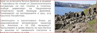 Αρχαίος Ναός αφιερωμένος στην ελληνίδα θεά Δήμητρα και την θυγατέρα της Περσεφόνη ανακαλύφθηκε από βουλγαρική αρχαιολογική αποστολή στο ακρωτήριο ‘Σκαμνί’/ Скамни- Skamni, της Σωζόπολης, δήλωσε ο διευθυντής του Εθνικού Μουσείου Ιστορίας, Μπόζινταρ Ντιμιτρόφ.