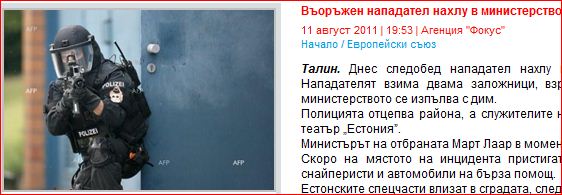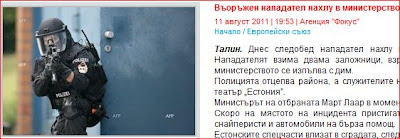 Ένας ένοπλος εισέβαλε σήμερα το απόγευμα στο κτίριο του υπουργείου Άμυνας της Εσθονίας. Ο επιτιθέμενος πήρε δύο ομήρους και έριξε χειροβομβίδα στο εσωτερικό του κτιρίου ανοίγοντας συγχρόνως πυρ.