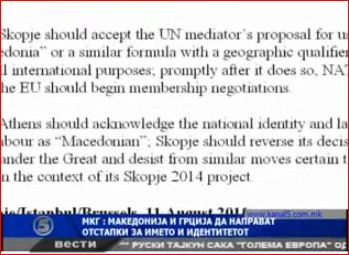 « Τα Σκόπια θα πρέπει να πάψουν να ονομάζουν το αεροδρόμιό τους «Αλέξανδρος ο Μακεδόνας» που αποτελεί πρόκληση για την Ελλάδα και να παραιτηθούν από το έργο ‘Σκόπια 2014’, τότε η Αθήνα θα αποσύρει την απαίτηση της αλλαγής της εθνικής ταυτότητας και γλώσσας και θα αποδεχτεί την ονομασία ‘Μακεδόνες’ », γράφει συγκεκριμένα η έκθεση της αμερικανικής Ομάδας.