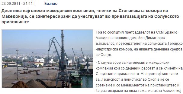 Δεκάδες σκοπιανές εταιρείες, μέλη του Οικονομικού Επιμελητηρίου των Σκοπίων, είναι πρόθυμες να συμμετάσχουν στην ιδιωτικοποίηση του Λιμένος Θεσσαλονίκης.