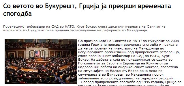 «Με την ενδιάμεση συμφωνία, η Ελλάδα είχε δεσμευθεί να υποστηρίξει την ένταξη της πΓΔΜ σε διεθνείς οργανισμούς με την ονομασία «FYROM». Η Ελλάδα όμως παραβίασε τη συμφωνία παρατείνοντας το χρόνο για την ένταξη της πΓΔΜ στο ΝΑΤΟ», δήλωσε ο Γουόκερ.
