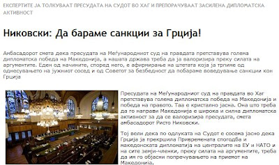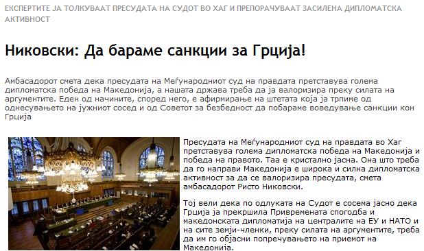 Η απόφαση του Διεθνούς Δικαστηρίου της Χάγης είναι μια μεγάλη διπλωματική νίκη για τα Σκόπια και συγχρόνως νίκη του Νόμου. Αυτό είναι απολύτως σαφές. Από εδώ και πέρα τα Σκόπια πρέπει να προβούν σε μια ευρεία διπλωματική δραστηριότητα για να επισημάνουν την αξιολόγηση της ετυμηγορίας, δήλωσε ο Πρέσβης Ρίστο Νικόφσκι.