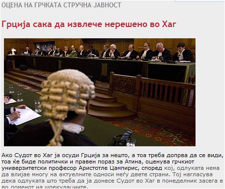 «Εάν το Δικαστήριο της Χάγης καταδίκαζε την Ελλάδα για κάτι, το οποίο δεν έχει ακόμη καθοριστεί, θα αποτελούσε μια νομική και πολιτική ήττα για την Αθήνα», ισχυρίζεται ο Έλληνας πανεπιστημιακός καθηγητής, Αριστοτέλης Τσιαμπίρης, σύμφωνα με τον οποίο, η απόφαση δεν θα επηρέαζε πολλές από τις σημερινές σχέσεις των δύο πλευρών.