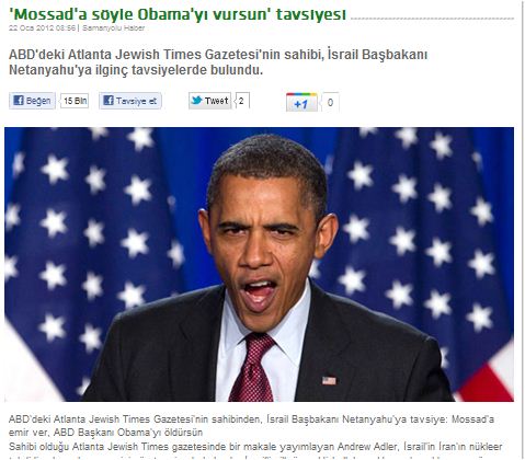 Ενδιαφέρουσες συμβουλές δημοσιεύθηκαν προς τον Ισραηλινό πρωθυπουργό Μπέντζαμιν Νετανιάχου, στην εφημερίδα της Ατλάντα των ΗΠΑ, ‘Εβραϊκά Χρονικά’ - Jewish Times: «Δώσε εντολή στη Μοσάντ να σκοτώσει τον Ομπάμα», όπως σημειώνει χαρακτηριστικά το πιο πάνω τουρκικό δημοσίευμα.