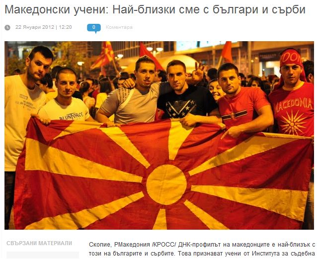 Σύμφωνα με την ανάλυση των γενετικών πληροφοριών (DNA) που έκαναν επιστήμονες από τα Σκόπια, διαπιστώθηκε ότι το σύσταση των γονιδίων των σλαβικής καταγωγής πολιτών της FYROM, βρίσκονται πολύ κοντά στα γονίδια των Σέρβων και των Βουλγάρων.