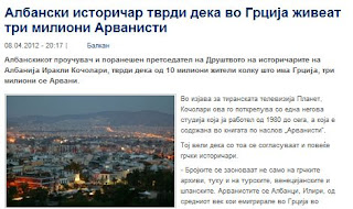 Ο Αλβανός ερευνητής και πρώην πρόεδρος της Εταιρείας Ιστορικών της Αλβανίας, Ηρακλή Κοτσολάρι, ισχυρίζεται ότι από τα 10 εκατομμύρια του ελληνικού πληθυσμού που ζει στην Ελλάδα, τα τρία εκατομμύρια είναι Αρβανίτες, αναφέρει το σκοπιανό κανάλι Σίτελ.