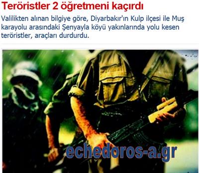 Σύμφωνα με πληροφορίες από το γραφείο του κυβερνήτη του Ντιγιαρμπακίρ στην εθνική οδό, στην περιοχή Κούλπ του Μους τρομοκράτες σταμάτησαν τα οχήματα και απήγαγαν από αυτά δύο καθηγητές.