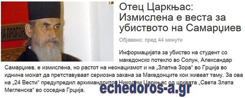 Σε αυτήν την προειδοποίηση προέβη ο Αρχιμανδρίτης Νικόδημος Τσαρκνιάς της λεγόμενης από τους Σλάβους εκκλησίας «Αγίας Ζλάτα (Χρυσής) Μεγκλένσκα»- (Света Злата Мегленска) στην Ελλάδα(…)