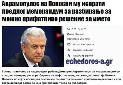 Ο Έλληνας υπουργός Εξωτερικών Δημήτριος Αβραμόπουλος, έστειλε επιστολή στον υπουργό Εξωτερικών των Σκοπίων στην οποία εμπεριέχεται σχέδιο μνημονίου κατανόησης, το οποίο καθορίζει τις βασικές παραμέτρους για μια πιθανή αποδεκτή λύση, ενταγμένο στο πλαίσιο των διαπραγματεύσεων, οι οποίες πρέπει να συνεχιστούν, σημειώνει χαρακτηριστικά το σλαβικό δημοσίευμα και παραθέτει την επιστολή: