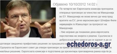 «Τα Σκόπια δεν μπορούν να περιμένουν για πάντα πίσω από τις θύρες της Ευρωπαϊκής Ένωσης», δήλωσε ο Επίτροπος της Διεύρυνσης Στέφαν Φούλε, ανακοινώνοντας την έκθεση προόδου για τα Σκόπια.