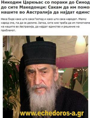 Ορισμένοι πάντως μητροπολίτες στη Σύνοδο της Εκκλησίας των Σκοπίων διατείνονται ότι παπά Νικόδημος είναι πολύ σημαντικό να μείνει στην αποστολή του στη Βόρεια Ελλάδα από το να πάει στην Αυστραλία.