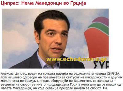 Στην ερώτηση του Σκοπιανού ανταποκριτή πως δικαιολογείται η ελληνική πολιτική να παρεμβαίνει στα δικαιώματα των Σλάβων και των άλλων εθνοτήτων στην Ελλάδα, των Τούρκων ή των Τσαμουριωτών-Αλβανών, ο Τσίπρας προσποιήθηκε ότι δεν ήξερε ότι υπάρχουν Σλαβομακεδόνες στην Ελλάδα, σημειώνει το δημοσίευμα της σλαβικής εφημερίδας των Σκοπίων Dnevnik.
