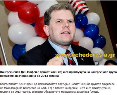 Το πρώτο μέλος του αμερικανικού κογκρέσου που προσχώρησε στην ομάδα Φίλων των Σκοπίων το 2013 είναι ο Νταν Μαφέι, που ανήκει στο Δημοκρατικό Κόμμα, σύμφωνα με πληροφορίες από την Ένωση της Σλαβικής Διασποράς στις ΗΠΑ.