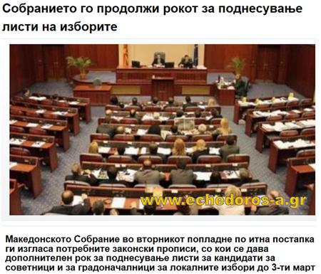 Το Κοινοβούλιο των Σκοπίων ενέκρινε την Τρίτη το απόγευμα, μετά από μία διαδικασία έκτακτης ανάγκης, να περάσει νομοθεσία που θεωρήθηκε απαραίτητη και η οποία προβλέπει πρόσθετο χρόνο για την υποβολή των καταλόγων των υποψηφίων για συμβούλους και δημάρχους των τοπικών εκλογών μέχρι την 3η Μαρτίου (ημέρα Κυριακή).