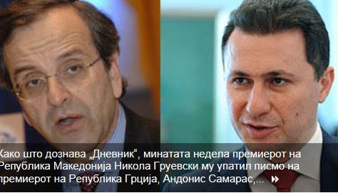 Σύμφωνα με πληροφορίες τις οποίες επικαλείται η νοτιοσλαβική εφημερίδα «Dnevnik» ο πρωθυπουργός του νοτιοσλαβικού κράτους, Νίκολα Γκρούεφσκι, «απέστειλε επιστολή προς τον πρωθυπουργό της Ελλάδας, Αντώνη Σαμαρά, στην οποία