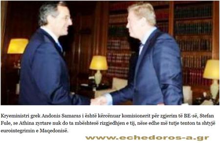 Πηγές από υψηλούς αξιωματούχους της Ευρωπαϊκής Ένωσης, που επιμένουν στην ανωνυμία τους, προς το σκοπιανό πρακτορείο ειδήσεων, δήλωσαν ότι οι Φούλε είχε λάβει προηγουμένως άμεση απειλή από τον πρόεδρο της κυβέρνησης στην Ελλάδα, ‘να ξεχάσει την ελληνική ψήφο στην προσπάθειά του για μια δεύτερη θητεία το 2014, εάν συνεχίσει να πιέζει για ένταξη των Σκοπίων στην Ευρωπαϊκή Ένωση’.
