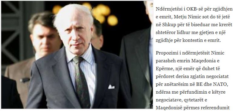 Η πρόταση του μεσολαβητή προβλέπει το όνομα «Άνω Μακεδονία», ένα όνομα που θα πρέπει να χρησιμοποιείται έως ότου συνεχίζονται οι διαπραγματεύσεις με την ΕΕ και το ΝΑΤΟ και με την ολοκλήρωση αυτών, οι πολίτες των Σκοπίων μέσω δημοψηφίσματος πρέπει να ψηφίσουν σε δύο ζητήματα: για την ένταξη στην ΕΕ και στην αναγνώριση της Δημοκρατίας της Άνω Μακεδονίας.