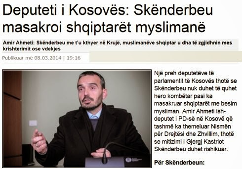 Πολιτικός, πρώην βουλευτής του κοινοβουλίου του Κοσσυφοπεδίου, ισχυρίζεται ότι ο Σκεντέρμπεης (1405 – 1468) δεν πρέπει να αποκαλείται εθνικός ήρωας των Αλβανών, διότι έχει σφάξει πολλούς Αλβανούς που πίστευαν στη μουσουλμανική θρησκεία.