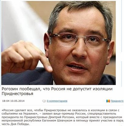 «Η Ρωσία θα κάνει τα πάντα για να μην απομονωθεί η Υπερδνειστερία σε σχέση με τα γεγονότα στην Ουκρανία», δήλωσε ο αναπληρωτής πρωθυπουργός της Ρωσίας και ειδικός απεσταλμένος του προέδρου, Ντμίτρι Ρογκόζιν, σχετικά με την Υπερδνειστερία, η οποία μαζί με τον πρόεδρο –της μη αναγνωρισμένης δημοκρατίας- τον Ευγκένι Σέβτσουκ, την Παρασκευή έλαβε μέρος στην παρέλαση προς τιμήν της Ημέρας της Νίκης.
