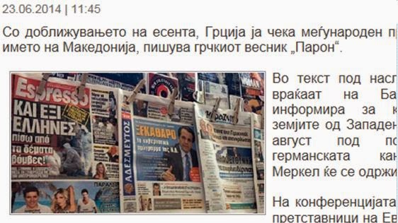 »Σε ένα άρθρο με τίτλο «Οι Γερμανοί επιστρέφουν στα Βαλκάνια» η ελληνική εφημερίδα «το Παρόν», αναφέρεται στην προγραμματισμένη Διάσκεψη των Δυτικών Βαλκανίων, στις 28 Αυγούστου 2014, που θα πραγματοποιηθεί υπό την αιγίδα της Γερμανίδας Καγκελαρίου Άνγκελα Μέρκελ, στο Βερολίνο, γράφει το σλαβικό δημοσίευμα των Σκοπίων.