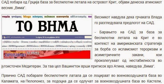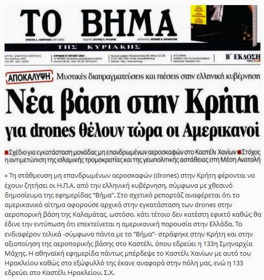 Το αίτημα των ΗΠΑ για βάση μη επανδρωμένων εντάσσεται στο πλαίσιο της στρατηγικής των ΗΠΑ για την καταπολέμηση της ισλαμικής τρομοκρατίας και των ασύμμετρων απειλών που προέρχονται από την αστάθεια που επικρατεί στην περιοχή της νοτιοανατολικής Μεσογείου. Για το λόγο αυτόν η Ουάσιγκτον πιέζει την Αθήνα για την παραχώρηση, σημειώνει το δημοσίευμα.