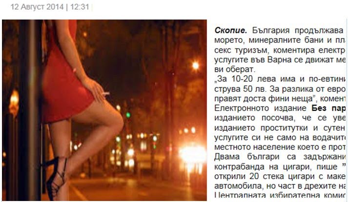 Η σκοπιανή ιστοσελίδα «Χωρίς Συγνώμη»- Μπεζ Μπαρνόν- αναφερόμενη στην άνθιση της πορνείας στη Βουλγαρία, σημειώνει την πληθώρα ιεροδούλων στις εθνικές οδούς. Αναφέρεται, μάλιστα, στην κατάληψη ενός νηπιαγωγείου στην πόλη Ρούσε, από τις πόρνες και τους νταβατζήδες που εξυπηρετούσαν τους φορτηγατζήδες και τους σπουδαστές στην πόλη. Προκλήθηκε, όμως αντίδραση από τους κατοίκους της πόλης που διαμαρτυρήθηκαν στην αστυνομία ζητώντας να διώξουν τις πόρνες, σημειώνει χαρακτηριστικά το ‘Φόκους’.