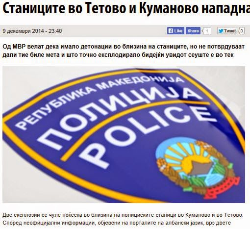 Σύμφωνα με ανεπίσημες πληροφορίες- όπως σημειώνει η σλαβική των Σκοπίων ‘Βέτσερ’- στα δύο αστυνομικά τμήματα ρίχθηκαν χειροβομβίδες.