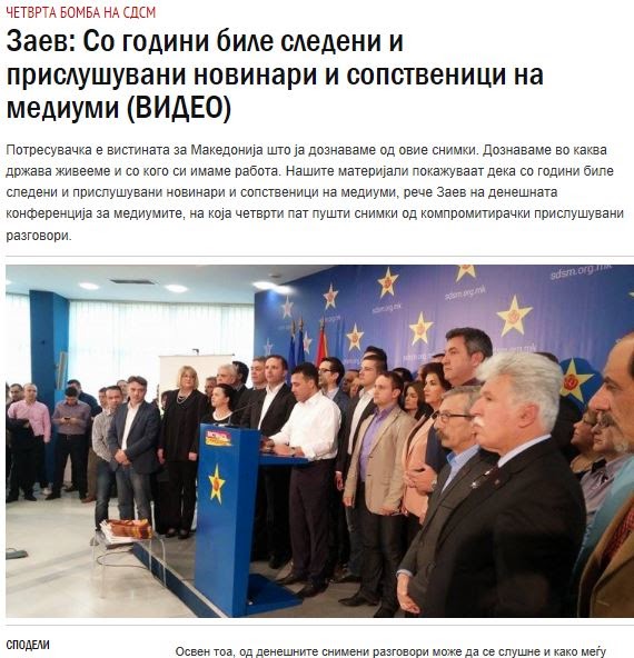 Όλα αυτά έχουν γίνει στα γραφεία του Κέντρου της Ασφάλειας και Πληροφοριών, με την παρακολούθηση πάνω από 100 δημοσιογράφων καθώς και φιλο- κυβερνητικών, που τηρούσαν αυστηρά τον κανόνα της κυβέρνησης. Έτσι από τις συνομιλίες αυτές που δίδονται στη δημοσιότητα αποδεικνύεται η άμεση σύζευξη του πρωθυπουργού με την χειραγώγηση των ιδιωτικών μέσων ενημέρωσης», δήλωσε ο Ζάεφ.