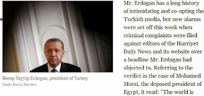 Το δημοσίευμα σημειώνει ότι ο Ερντογάν επιτίθεται κατά του ομίλου Dogan, στην οποία ανήκει η εφημερίδα «Χουριέτ» με συλλήψεις δημοσιογράφων και συγχρόνως αναφέρει τον τρόπο με τον οποίο αντέδρασε η Τουρκία στη θανατική ποινή που επιβλήθηκε στον πρόεδρο της Αιγύπτου, Μοχάμεντ Μόρσι.