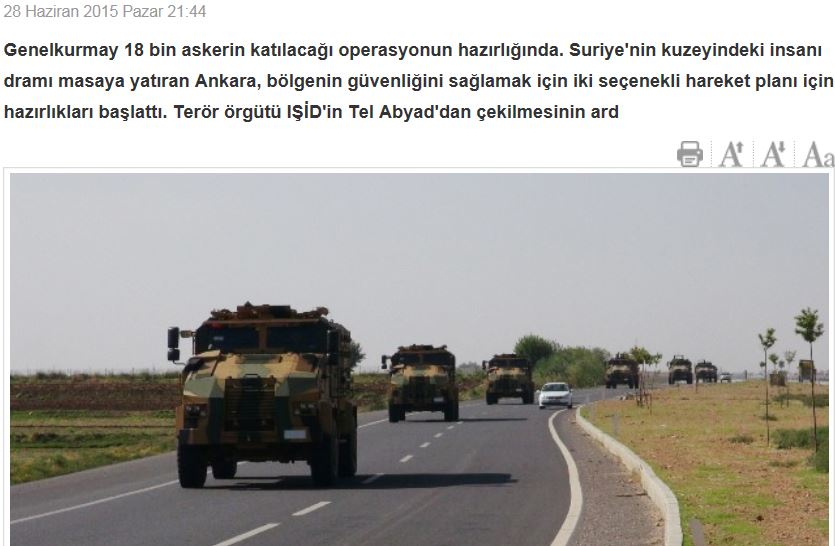 «Η Άγκυρα για να εξασφαλίσει την ασφάλεια στην περιοχή άρχισε να προετοιμάζει ένα σχέδιο δράσης δύο επιλογών, ιδιαίτερα μετά την αποχώρηση των μαχητών του ‘ισλαμικού κράτους’ από την πόλη Τελ Αμπιάντ», σημειώνει το δημοσίευμα.