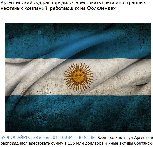 Ομοσπονδιακό δικαστήριο της Αργεντινής διέταξε την κατάσχεση του συνόλου των 156 εκατομμύριων δολαρίων και άλλων περιουσιακών στοιχείων των βρετανικών και αμερικανικών εταιρειών πετρελαίου που ασχολούνται με την παραγωγή πετρελαίου στα Νησιά Φώκλαντ ή Μαλβίνες.