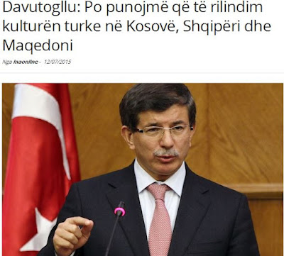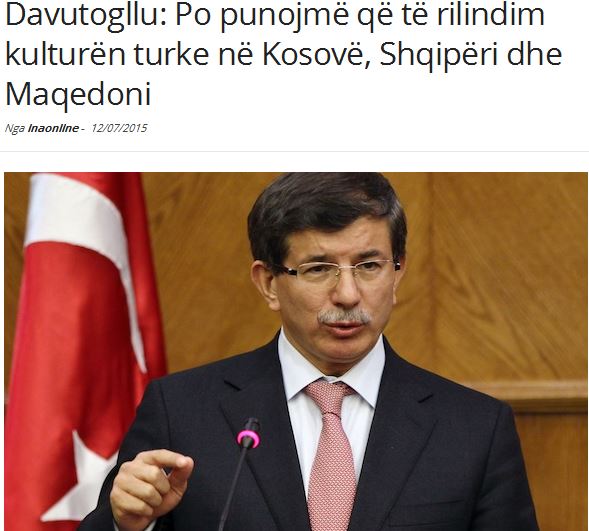 Ο πρωθυπουργός της Τουρκίας, Αχμέτ Νταβούτογλου, αφού πραγματοποίησε επίσκεψη στα Σκόπια, δήλωσε σήμερα , ότι η Τουρκία εργάζεται για την αναβίωση του τουρκικού πολιτισμού σε ορισμένες βαλκανικές χώρες. Μάλιστα, καθόρισε τις χώρες αυτές λέγοντας την Αλβανία, το Κοσσυφοπέδιο, τα Σκόπια και τη Βοσνία.