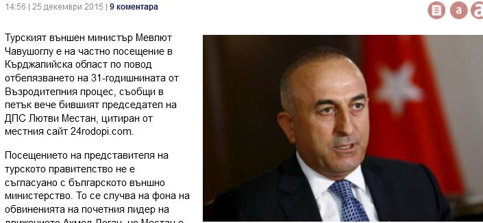 Ο Τούρκος υπουργός Εξωτερικών, Μεβλούτ Τσαβούσογλου, βρίσκεται στην Κάρτζαλι της Βουλγαρίας, ανεπίσημα, στην 31η επέτειο της διαδικασίας της Αναγέννησης, δήλωσε ο πρώην πρόεδρος του «Κινήματος Δικαιωμάτων και Ελευθεριών»- DPS, Λούτβι Μεστάν, όπως δημοσιεύει η τοπική βουλγαρική ιστοσελίδα «24rodopi».