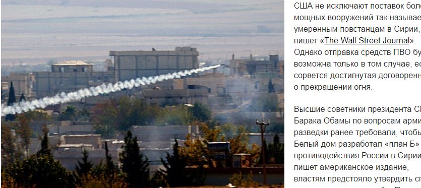Οι Ηνωμένες Πολιτείες δεν αποκλείουν την προμήθεια πιο ισχυρών όπλων στις λεγόμενες μετριοπαθείς αντάρτες στη Συρία, γράφει η εφημερίδα The Wall Street Journal. Ωστόσο, η αποστολή των συστημάτων αντιαεροπορικής άμυνας θα είναι δυνατή μόνο με την κατάρρευση της συμφωνίας για την κατάπαυση του πυρός, σημειώνει η ρωσική ‘Ανεξάρτητη’ (Независимая газета).