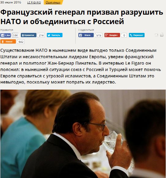 Την επαναπροσέγγιση Μόσχας- Άγκυρας, το ΝΑΤΟ έπληξε με τα πρόσφατα γεγονότα, που δείχνουν ότι οι Γάλλοι και οι Ευρωπαίοι γενικότερα βλέπουν ότι η Συμμαχία δεν βοηθά κατά της ισλαμικής απειλής, αλλά κάνει το αντίστροφο, δημιουργεί μέτωπο κατά της Ρωσίας.