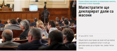 Ένας δικαστής έχει το δικαίωμα να είναι Μασόνος, αλλά δεν πρέπει να το κρύβει. Αυτό εν ολίγοις αποφάσισε το βουλγαρικό Κοινοβούλιο μετά από ώρες διαφωνιών σχετικά με την ένταξη των δικαστών σε μυστικές μασονικές στοές και σε επαγγελματικές οργανώσεις, γράφει το βουλγαρικό δημοσίευμα.