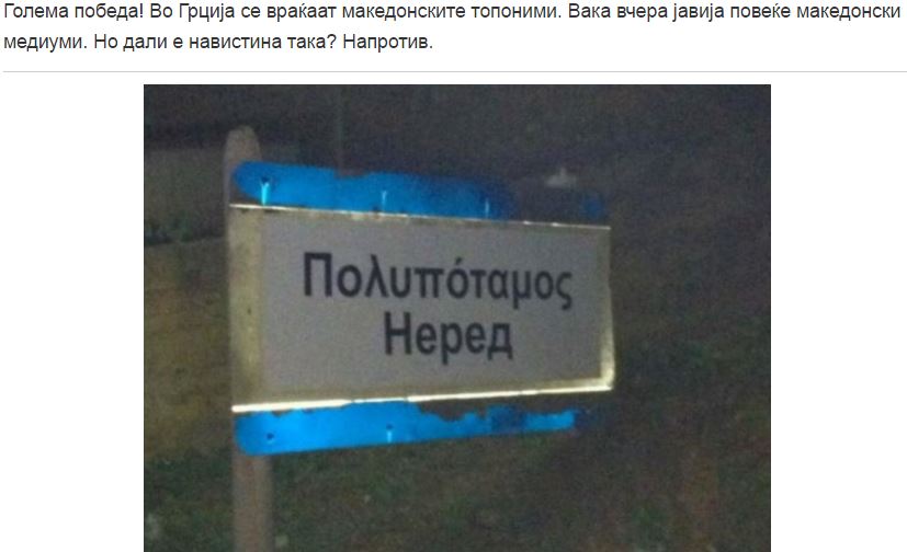 Χθες αρκετά σλαβικά μέσα ενημέρωσης των Σκοπίων, ανέφεραν ότι οι ελληνικές αρχές έχουν αλλάξει πολιτική σχετικά με τα σλαβικές ονομασίες χωριών και πόλεων στην Ελλάδα και επιστρέφουν οι ονομασίες όπως τις λένε οι Σλάβοι. Μάλιστα, δημοσιεύθηκε και μια φωτογραφία (αυτή επάνω) που δείχνει το χωριό Πολυπόταμος να έχει στα κυριλλικά τη σλαβική ονομασία Неред.