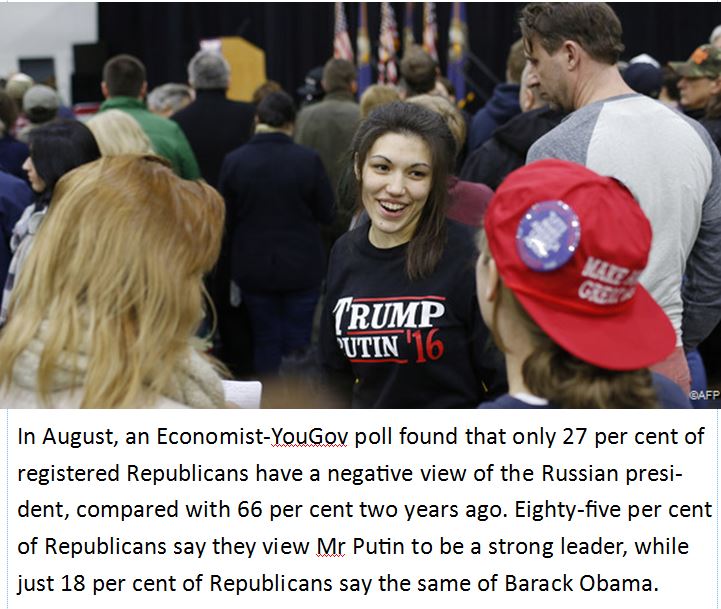 Σύμφωνα με δημοσκόπηση, η οποία διεξήχθη τον Αύγουστο από το Ινστιτούτο δημοσκοπήσεων ‘YouGov’ και το περιοδικό ‘The Economist’, μόνο το 27% των Ρεπουμπλικάνων αναφέρονται αρνητικά στο Ρώσο πρόεδρο. Πριν από δύο χρόνια ο δείκτης αυτός ήταν στο 66%, σύμφωνα με το δημοσίευμα.