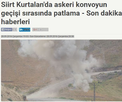 Σήμερα, νωρίς το βράδυ κατά τη διάρκεια διέλευσης μιας στρατιωτική φάλαγγας στο χωριό Μπεϊκέντ στην επαρχία Σιίρτ, εξερράγη εκρηκτικός μηχανισμός επί της οδού, που είχαν τοποθετήσει οι τρομοκράτες του PKK, γράφει τούρκικο δημοσίευμα.
