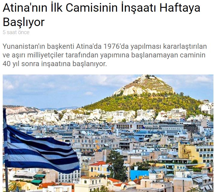 Η Ελλάδα είχε συμφωνήσει από το 1976 να κατασκευασθεί στην Αθήνα ένα τζαμί, αλλά εδώ και 40 χρόνια δεν είχε ξεκινήσει η κατασκευή του εξαιτίας των ακροδεξιών, γράφει τούρκικο δημοσίευμα.