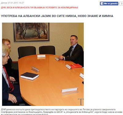 Τα τρία αλβανικά κοινοβουλευτικά κόμματα -στο νότιο σλαβικό κράτος των Σκοπίων, ανέφεραν ότι αντλούν τα αιτήματά τους από την ελεύθερη και δημοκρατική βούληση των Αλβανών ψηφοφόρων όπως εκφράστηκαν στις πρόωρες κοινοβουλευτικές εκλογές της 11ης Δεκεμβρίου, το πνεύμα της Συμφωνίας της Οχρίδας, την ευημερία και την μακροπρόθεσμη σταθερότητα της Ψευδομακεδονίας και την αποφασιστικότητα για καμία εναλλακτική λύση στην ενσωμάτωση στο ΝΑΤΟ και την ΕΕ.
