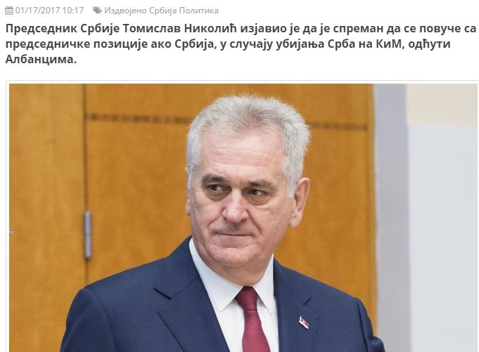 Ο πρόεδρος της Σερβίας, Τόμισλαβ Νίκολιτς, δήλωσε ότι είναι έτοιμος να παραιτηθεί από την προεδρία, εάν η Σερβία παραμείνει σιωπηλή σε περίπτωση δολοφονιών Σέρβων στο Κοσσυφοπέδιο.