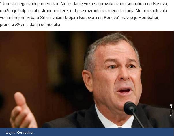 Ο Ρεπουμπλικάνος γερουσιαστής Ντέινα Ροραμπάχερ (Dana Rorabaher) ο οποίος προεδρεύει στην Υποεπιτροπή Εξωτερικών Υποθέσεων για την Ευρώπη, την Ευρασία και των αναδυόμενων απειλών, σε επιστολή του προς τον πρόεδρο της Σερβίας, προτείνει την ανταλλαγή εδαφών μεταξύ Σερβίας και Κοσσυφοπεδίου για την επίλυση των εντάσεων σε αυτό το μέρος των Βαλκανίων.