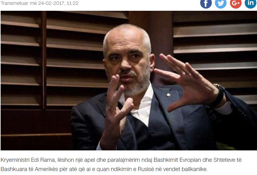 Ο πρωθυπουργός της Αλβανίας, Έντι Ράμα, έκανε έκκληση- προειδοποίηση, προς την Ευρωπαϊκή Ένωση και τις Ηνωμένες Πολιτείες, για αυτό που αποκαλεί ‘επιρροή της Ρωσίας στις χώρες των Βαλκανίων’.