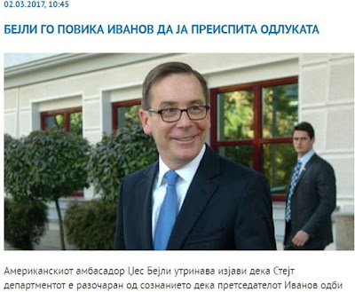 Ο πρέσβης των Ηνωμένων Πολιτειών, Τζες Μπέιλι, σήμερα το πρωί δήλωσε ότι το Στέιτ Ντιπάρτμεντ είναι απογοητευμένο από την απόφαση του προέδρου του νοτιου σλαβικού κράτους των Σκοπίων, Γκιόργκε Ιβάνοφ να αρνηθεί να δώσει εντολή σχηματισμού κυβέρνησης στους εκπροσώπους μιας σαφούς κοινοβουλευτικής πλειοψηφίας.